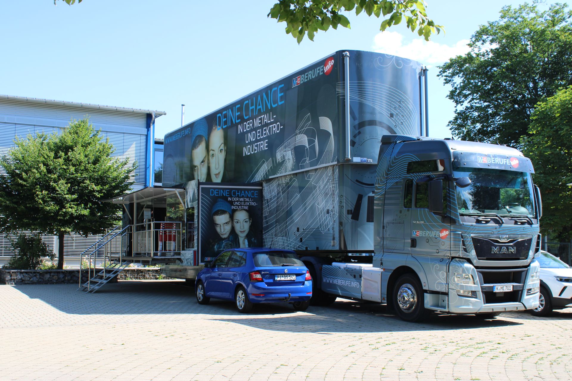 Über Nacht wurde nicht etwa ein weiteres Gebäude auf den Schulhof des Bildungszentrums in Bodnegg gezaubert – vielmehr handelte es sich um einen überdimensionalen Truck mit zwei Etagen. Doch wozu das Ganze? Stichwort: Berufsinformation in Theorie und Praxis. Schüler*innen der achten Klassen am Bildungszentrum erhielten wertvolle Informationen zu Ausbildungsmöglichkeiten und Berufsbildern in der Metall- und Elektroindustrie. Mehrere Stationen im „Erdgeschoss“ des Trucks luden zum Experimentieren ein. So gab es eine CNC-Fräsmaschine an welcher über eine eigens vorgenommene Programmierung das Fräsen eines Werkstücks möglich war. Weiterhin bot ein assistierender Roboterarm Einblicke in Prozesse, die das Digitale mit dem Analogen per Arbeiten an einem Zahnradgetriebe verbanden. Neben einem Pneumatik-Modell gab es Stecker-Exponate sowie Gewindestangen und einen Elektro-Arbeitsplatz, an welchem das Grundverständnis für Elektrotechnik aufgezeigt wurde. Im „Obergeschoss“ des Trucks standen Gespräche und die Theorie im Vordergrund. Insgesamt schätzten die Schüler es sehr, dass sie in einem solch ungewöhnlichen Aufbau sozusagen um die (Pausenhof)-Ecke Informationen rund um die Berufsbereiche Metall und Elektro erhielten. Bereitgestellt wurde der Truck vom Arbeitgeberverband Gesamtmetall, dem Dachverband der Metallarbeitgeberverbände in Deutschland.