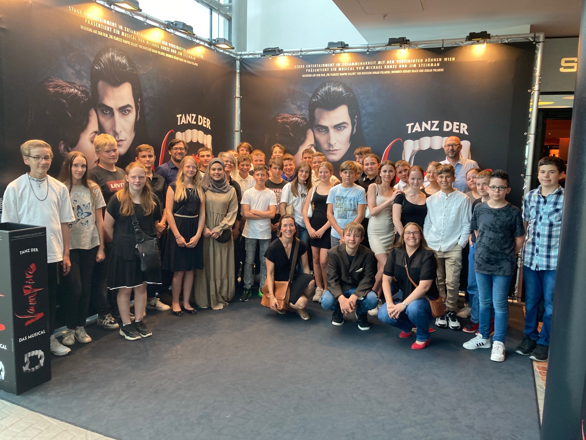 Musical? Was ist das? Als die Schüler den Vorschlag Musical von Herrn Kirchmaier hörten, waren viele fragende Gesichter zu sehen. Was erwartet uns da? Gehen da nur alte Leute hin? Wie bitte, nur angemessene Kleidung? Vampire, gibt es die wirklich? Mit diesen Fragen im Gepäck machten wir (die Klassen 7d und 7e) uns gemeinsam mit unseren LehrerInnen Frau Miller, Frau Obert, Frau Rech, Herr Kirchmaier und Herr Fischer am 6. Juli auf den Weg nach Stuttgart. Nach einer abwechslungsreichen interaktiven Schnitzeljagd in der Innenstadt und anschließender Freizeit kamen wir mit erwartungsvoller Anspannung am SI-Centrum an. Dort wurde erstmal die Kleidung „gecheckt“ und wir waren nachweislich so chic wie noch nie!