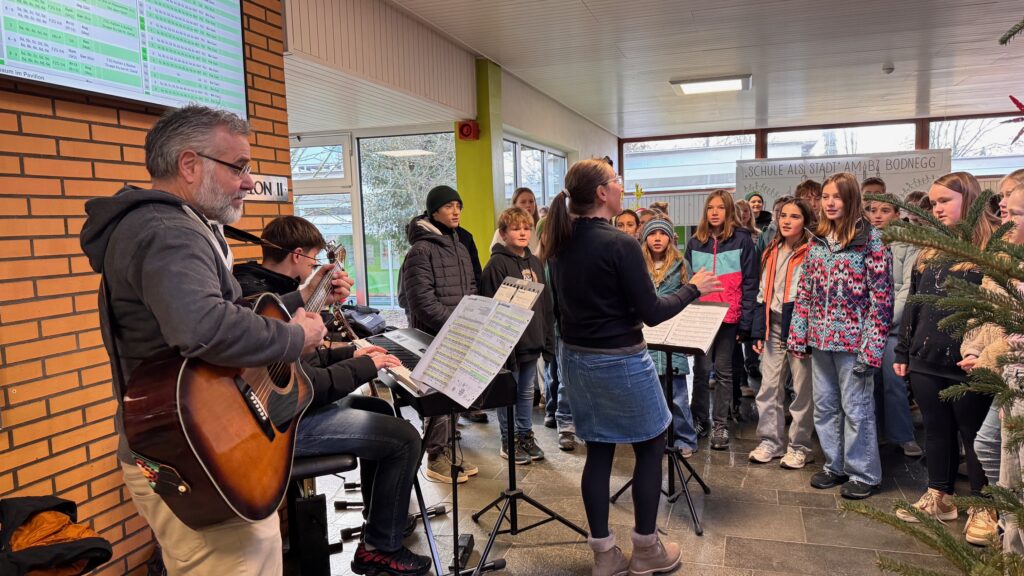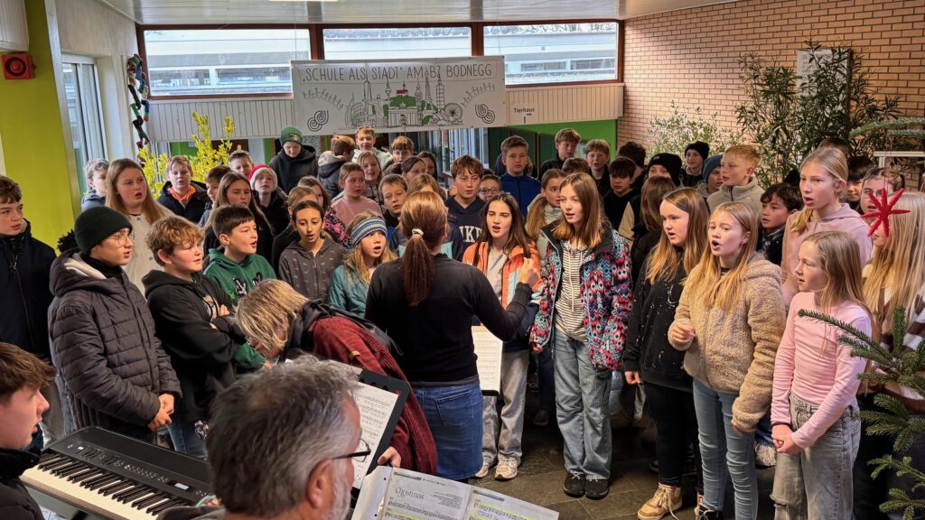 Mit hohem musikalischen Können sang er sich in die Herzen der rund hundert Gäste: der Grundschulchor des Bildungszentrums Bodnegg. 55 disziplinierte Kinder in einheitlich bunten T-Shirts überzeugten beim Adventsnachmittag der Bodnegger Seniorinnen und Senioren am 09. Dezember im voll besetzten Dorfgemeinschaftshaus und erhielten begeisterten Beifall der Anwesenden. Unter Leitung ihrer Lehrkräfte Daniela Diehm und Benjamin Jacob sang der Chor schöne Advents- und Weihnachtslieder. Schülerinnen und Schüler der 3b beeindruckten mit passenden Reimen dazwischen. Begleitet wurde der Chor von Isabel Eberle am Klavier, Elisabeth Renz betreute die muntere Gruppe. Einhellige Meinung: „Das war Spitze“! Ein professioneller Kinderchor, auf den das Bildungszentrum stolz sein kann. Herzlichen Dank an Daniela Diehm, Elisabeth Renz, Isabel Eberle und Benjamin Jacob – gleichermaßen an alle beteiligten Schülerinnen und Schüler. Herzlichen Dank des Seniorenteams Bodnegg an alle Beteiligten. Klara Mikolitsch