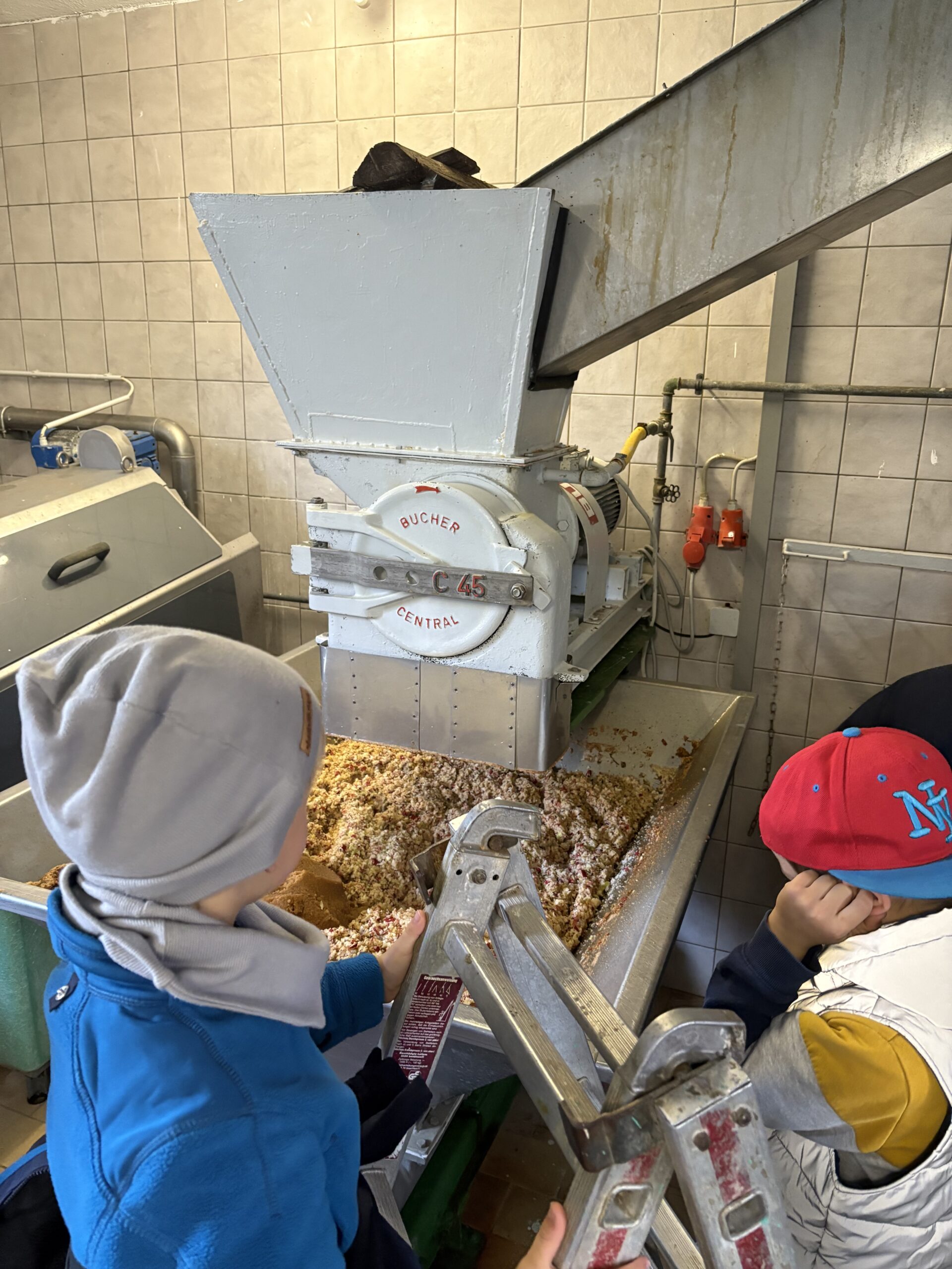Mit großem Interesse verfolgten die Schülerinnen und Schüler jeden Schritt – vom Waschen und Zerkleinern der Äpfel bis hin zum Pressen und Abfüllen des Saftes. Besonders spannend war es natürlich, am Ende den frisch gepressten Apfelsaft zu probieren – ein Genuss, der allen sichtlich schmeckte!