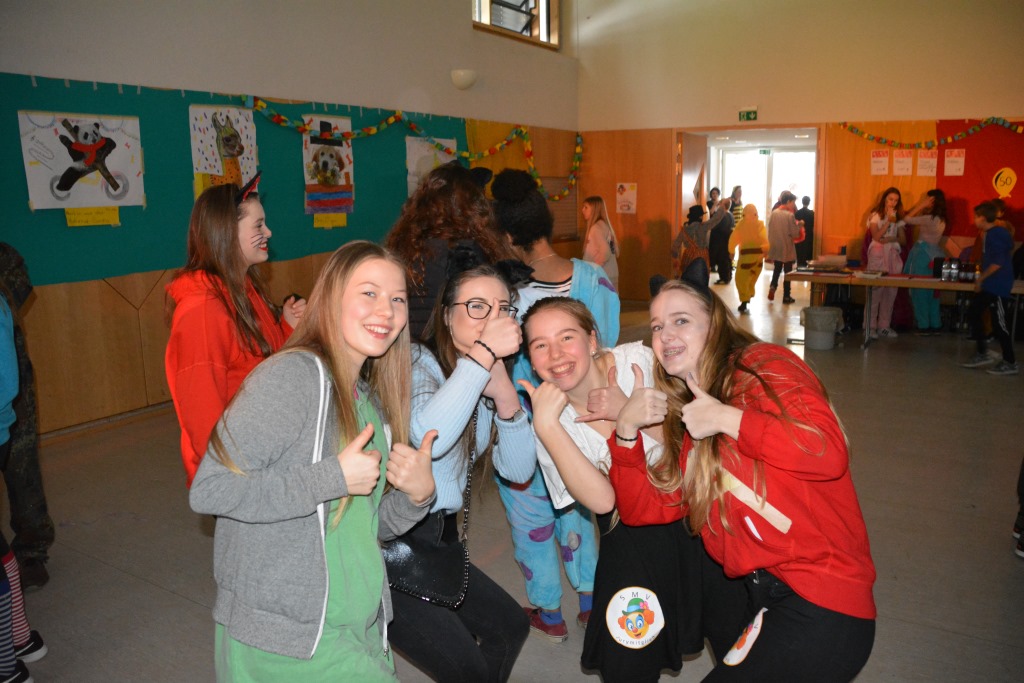 In der Festhalle herrschte dagegen Partystimmung. Die SMV und die Verbindungslehrer hatten eingeladen. Närrische und aktuelle Popmusik sorgte für die richtige Stimmung und fastnachtliches Schwofen. Ausgelassene Fröhlichkeit und gute Unterhaltung war angesagt und kam auch gut an. Selbst die dort zu findenden Lehrerinnen und Lehrer hatten beste Laune. Gegen 10 Uhr war es dann für die Grundschüler soweit: die Bodnegger Brotfresser und die nicht zu überhörende Kapelle der „Butzlumpa“ (für Nicht- Schwaben: „Putztücher“) rückten näher und nach traditionellem Brauch wurden die Grundschüler (endlich) befreit. Selbstverständlich gab es für alle Kinder und ihre Lehrkräfte eine besondere Mahlzeit in Form von noch warmen, frischen Brezeln, die reißenden Absatz fanden und genüsslich verspeist wurden.