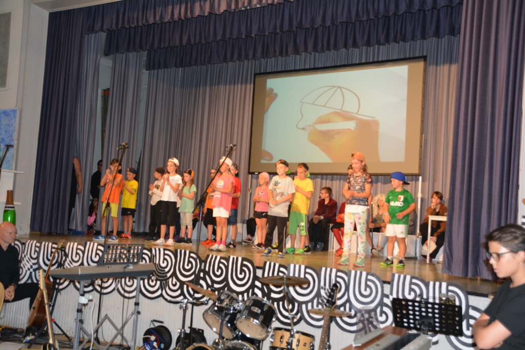 Durch das Zusammenwirken vieler Kolleginnen und Kollegen, durch die Beteiligung vieler Schülerinnen und Schüler, durch ein hervorragendes Technikteam konnte eine überzeugende und begeisternde Inszenierung des Musicals geboten werden. Eine minimalistische Bühnenausstattung wurde durch ein „wachsendes“ live gezeichnetes und an die Rückwand projiziertes Bühnenbild im Stil der Montagsmaler ergänzt. Der Chor aus Schülerinnen der Klassen 5-7 (Leitung Hr. Matt), die beteiligten Instrumentalensembles musizierten kultiviert und bestens verständlich, einzelne Schülerinnen traten dabei als Solistinnen auf. Die Tanzeinlagen der Grundschüler aus der 2b wurden zum höchst vergnüglichen Hingucker. Die Szene in der Grundschule löste große Heiterkeit im Publikum aus. Das Theaterensemble (Einstudierung Fr.Joseph/Fr. Baumgärtner/Hr. Dennenmoser/Hr. Fark) zeigte sich bestens vorbereitet und in bester Spiellaune. Besonders hervorzuheben sind die Rollen von Albert Piepenmurks und seiner Mutter, der Rektorin Obermüller, die Rollen von Sophie und Martin, u.a.m.