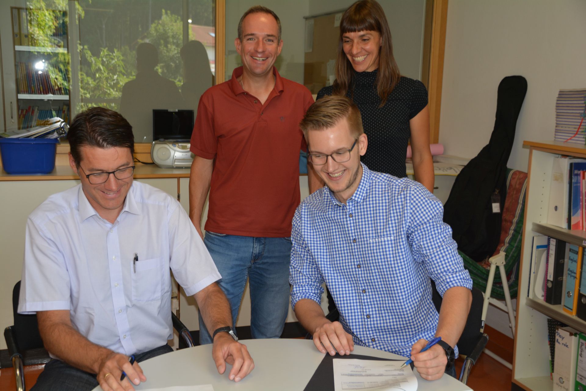 Das Bildungszentrum Bodnegg kümmert sich im Zuge seiner Berufsorientierung für die Schüler/innen stets um Kooperationspartner in der freien Wirtschaft. Die Anzahl der Partner ist jüngst auf stattliche 15 angestiegen. Denn mit dem Neuzugang namens „Käserei Bauhofer“ aus Kofeld bekommen die Schüler einen weiteren Bildungspartner aus der Region, der durch seinen landwirtschaftlichen Bezug das gesamte Portfolio perfekt ergänzt. So können Bodnegger Klassen in ihren berufsvorbereitenden Wochen in der neunten Klasse bereits in einen Betrieb „schnuppern“, der sich der traditionellen Käseherstellung verschrieben hat. Während seines Besuches am Bildungszentrum erläuterte Herr Bauhofer (Junior) die Vorzüge des Betriebes. So begann die Käseherstellung bereits im Jahre 1911 durch den Großvater von Martin Bauhofer. Inzwischen ist also bereits die dritte Generation am Werk. In Sachen Bio war die Käserei die erste, welche einen Biokäse herstellte. Mittlerweile arbeiten dort 40 Mitarbeiter, wovon die meisten Berufe Ausbildungsberufe seien. Ebenso gäbe es einen hohen Anteil angelernter Hilfkräfte sowie Milchtechnologen (ein Ausbildungsberuf, den man z.B. in Wangen absolvieren kann). Um die Ausbildung im Betrieb kümmern sich mittlerweile 2 Meister im Alter zwischen 25 und 35 Jahren. Bauhofer unterstrich, dass es sich bei der Käserei Bauhofer noch immer um einen handwerklichen Betrieb handle, bei dem man viel Fingerspitzengefühl benötigt. Hier grenzte er seinen Betrieb deutlich von Großbetrieben ab, wo der Einzelne oft nicht mehr viel mit dem Produkt zu tun habe, sondern z.B. lediglich eine Maschine bedienen würde. Im Bild bei der Unterzeichnung der Partnerschaft: (vorne, v.l.n.r.:) Schulleiter Alexander Matt, Michael Bauhofer; (im Hintergrund:) Herr Winkler, Karrierebegleiterin Frau Kuhn-Schwarz.