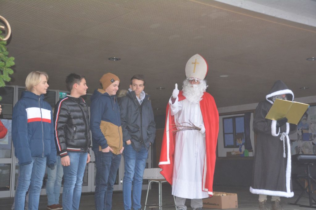 Es steht außer Frage, dass das Arbeitspensum des Nikolaus groß ist. Dennoch schafft er es jedes Jahr, auch dem Bildungszentrum einen Besuch abzustatten. Und so kam es, dass sich am 6. Dezember alle Menschen des täglichen Schulbetriebs vor dem Realschulbau versammelten. Mit bekannt sonorer Stimme las der Nikolaus aus seinem goldenen Buch vor und bedankte sich seit seinem letzten Besuch bei folgenden Personen: