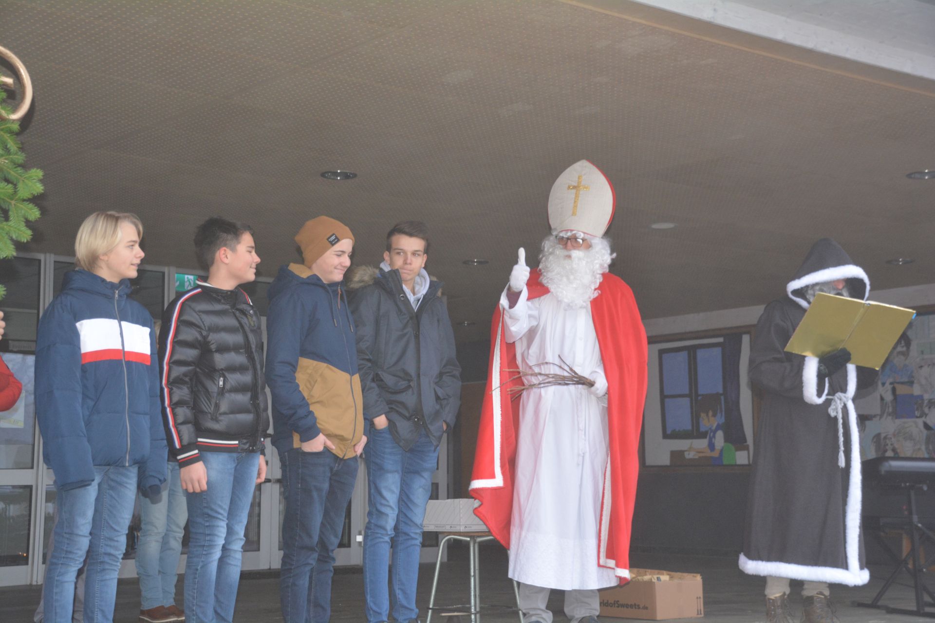 Herr Gebert, Frau Rech und Herr Locher für die technische Unterstützung; Frau Wiedmann für ihre zuverlässige Arbeit im Schulsekretariat; Frau Altherr für die Ausgabe der Essen-Marken und Busfahrkarten. Weitere Dankesworte gingen an Frau Mikolitsch, Frau Wäscher und Frau Hummel (Bücherei), Frau Fuchs (Schülercafé), Frau Schaufler (Spieleausgabe) und Frau Wetzel (Billardraum). Kollege Ruprecht schwang bei der Erwähnung der Bücherei kurz mit der Rute. Offenbar hielt sich manch junger Gast nicht an die dortigen Benimmregeln. Daraufhin wurde das Schülersprecherteam (SMV) zum Nikolaus beordert. Noah (9a), Niklas (10a), Frederik (7b) und Gianluca (8a) wurden für ihre SMV-Tätigkeiten geehrt; insbesondere am kommenden Schulprojekt „Schule als Stadt“ war der Nikolaus sehr interessiert und wird wohl im nächsten Jahr über das Resultat mit goldenem Buch berichten. Zusätzlichen Applaus ernteten die SMV-Unterstützer Herr Sachs, Frau Rupp, Herr Augustin, Herr Brandt, Frau Federau und Frau Kuhn-Schwarz. Anschließend wurde der Sieger des Wettbewerbs „Winterwonderland“ geeehrt. Hierbei ging es um die weihnachtliche Dekoration der Klassenzimmer und den ersten Platz sahnte die Klasse 6b mit ihrer Klassenlehrerin Frau De Salvo ab. Weitere Dankesworte gingen an die Hausmeister Herr Gessler und Herr Liebherr, die sich unermüdlich um Dinge wie Wasserqualität, Montagen, Gartenarbeiten und vieles mehr kümmern. Traditionell werden an diesem Tag auch die Schulsieger des Lesewettbewerbs genannt. Die Sechstklässlerin Carmina belegte den ersten Platz, gefolgt von Max, Lilly und Simon. Carmina darf nun zum Lesewettbewerb nach Ravensburg fahren und dort ihre Schule vertreten. Weitere Erwähnungen erfuhren die Klasse 5b für ihre sehr gute Klassengemeinschaft mit den Schülern der Martinusschule; die Streitschlichter Lukas und Noah aus der 9a; Jessica, Miriam und Miriam L. aus der 8d für ihre ehrenamtliche Unterstützung für das Tierhaus gemeinsam mit Frau Kirchhoff und Frau Gräßer-Wiesbauer; die Schüler Elena und Muhammed für Hilfsbereitschaft aus der Klasse 6a; Pia aus der 5d für ihr Mitwirken in Konfliktgesprächen und im Klassenrat; die gesamte Klasse 8d für ihr wesentlich besseres Verhalten im Vergleich zum letzten Schuljahr; Frau Dvorski für ihre Sozialarbeit; Frau Kuhn-Schwarz für ihre Hilfe bei der Suche nach Praktikumsplätzen und beim Vorbereiten der Schüler auf Bewerbungen; Herr Schupp und das gesamte Küchenteam für die täglich frisch gekochten Mahlzeiten inklusive Salatbuffet in der Mensa und im Lehrerspeisesaal, Frau Sauter für die tägliche Begleitung der Schülerin Gina. Letztlich gab es noch ein kollektives Lob vom Nikolaus an alle Schülerinnen und Schüler sowie Lehrerinnen und Lehrer, bevor er sich verabschiedete – dies jedoch erst, als er noch allen Anwesenden einen Schokoladen-Nikolaus hinterließ.
